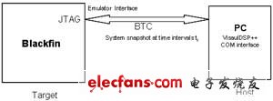 Blackfin處理器使用一個(gè)通用定時(shí)器定期地產(chǎn)生中斷。在定時(shí)器發(fā)出中斷時(shí),指標(biāo)寄存器的內(nèi)容被讀出并存儲(chǔ)在存儲(chǔ)器中。在主機(jī)發(fā)出請(qǐng)求時(shí),存儲(chǔ)的指標(biāo)寄存器數(shù)據(jù)通過(guò)BTC通道發(fā)送到PC。BTC通道支持?jǐn)?shù)據(jù)傳輸速率高達(dá)3Mbps。