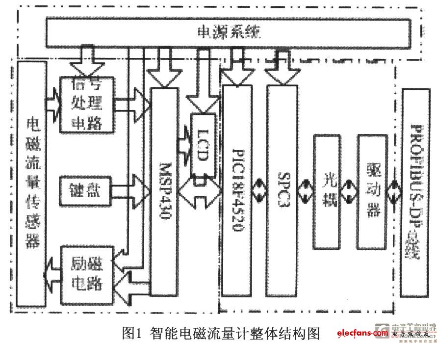 應用領域的日益擴大,用戶及研究部門都有自主研發(fā)或特殊調試的需求,下面將介紹結合智能化技術與現(xiàn)場總線技術,開發(fā)帶PROFIBUS-DP接口的智能電磁流量計。1 系統(tǒng)總體設計常用現(xiàn)場儀表系統(tǒng)的處理任務簡單