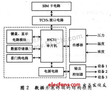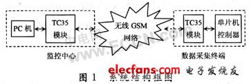 遠程數據采集系統(tǒng)由監(jiān)控中心和數據采集終端兩部分組成。監(jiān)控中心由帶有移動通信裝置TC35模塊的監(jiān)控計算機和數據庫服務器構成。TC35通信模塊的通信通過RS 232串口與監(jiān)控計算機連接;數據采集終端