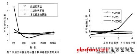 仿真2:為了分析低標簽密度時改進算法的性能,特設計以下仿真:采用改進算法,分別使用5~8位寄存器。高l~4位為高位,即分群群數(shù)分別為2、4、8和16。仿真結(jié)果如圖3所示,可以看到當標簽總數(shù)為20時,如果把高位寄存器的位數(shù)從4降到l,則平均碰撞次數(shù)從5 5回落到1.4。而當標簽總數(shù)為200和2000時,高位寄存器位數(shù)的改變對平均碰撞次數(shù)的影響不大。因此如果在某次仲裁中出現(xiàn)多次空傳,根據(jù)這個先驗知識,讀寫器可以在下一次仲裁時指示標簽改變寄存器高位個數(shù),以此降低空傳率,進而可以降低平均碰撞次數(shù)。