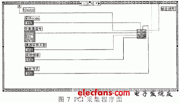 信號的采集部分在整個程序中至關重要。其參數(shù)設置正確與否,直接影響到后面的分析、處理、顯示等功能能否實現(xiàn)。LabVIEW本身提供了大量的控制對象,包含有專門用于設計數(shù)據(jù)采集程序和控制程序的功能庫和開發(fā)工具庫。其中,LabVIEW的數(shù)據(jù)采集程序庫包括了許多NI公司數(shù)據(jù)采集卡的驅動控制程序,本文采用的就是NI公司的LabVIEW PnP 1.24驅動程序。