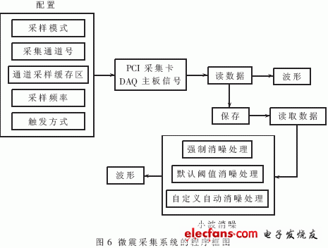 LabVIEW(Laboratory Virtual Instrument Engineering)是一種圖形化的編程語言。它廣泛地被工業(yè)界、學術界和研究實驗室所接受,被視為一個標準的數(shù)據(jù)采集和儀器控制軟件。LabVIEW集成了與滿足GPIB、VXI、RS-232和RS-485協(xié)議的硬件及數(shù)據(jù)采集卡通訊的全部功能,還內置了便于應用TCP/IP、ActiveX等軟件標準的庫函數(shù),是一個功能強大且靈活的軟件。利用它可以方便地建立自己的虛擬儀器,其圖形化的界面使得編程及使用過程都生動有趣。本文應用美國NI 公司LabVIEW 系統(tǒng)開發(fā)平臺并結合PCI數(shù)據(jù)采集卡(DAQ),對微震信號進行實時采集和波形的再現(xiàn)和分析。由于LabVIEW 強大的數(shù)據(jù)處理能力、豐富的數(shù)據(jù)表達方式和高效率,有力地支持和加快了系統(tǒng)的研制速度。