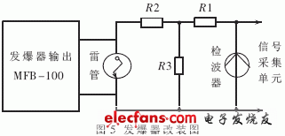 本文采用電阻分壓法引出爆炸信號,優(yōu)點是電路簡單,計時比較準確。圖5中R2為大功率限流電阻,R3為分壓輸出電阻,用以調節(jié)輸出爆炸信號電壓。