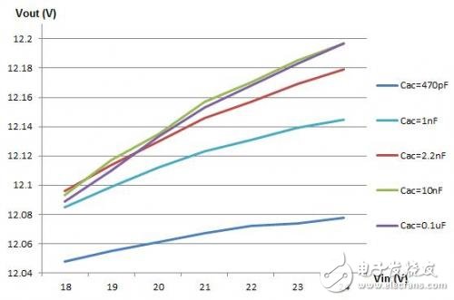圖 9 是在不同 Cac 時的輸入線性調(diào)整率比較,其測試條件為:輸入電壓是直流電壓,輸出電流為400mA,Rr 為 100koh,Cr 為 3300pF。從圖中可看出 Cac 越小,輸出電壓的線性調(diào)整率越好。
