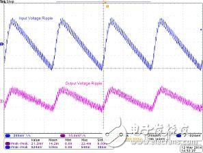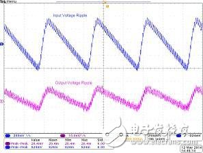 圖 6. Cac 為 10nF 時,輸入、輸出電壓紋波(400mA 輸出,Rr 為 100kohm,Cr 為 3300pF)
