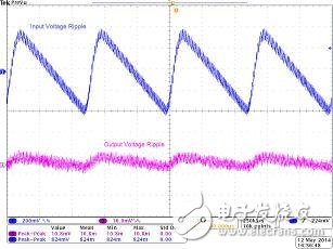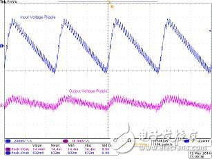 如圖 8 所示,與圖 7 相比,Rr 降為 49.9kohm,其輸出紋波的峰峰值增大到 14.4mV。