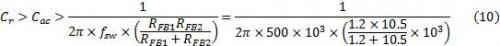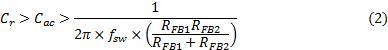 Cac 是為了除去 Cr 上的直流電平。從實驗上看,Cac 不能太大,Cac 過大,輸出電壓的線性調(diào)整 率會變差。同時,當輸入電壓有低頻波動時,輸出電壓上也會產(chǎn)生類似的低頻波動,導致輸出電壓 紋波過大。根據(jù) COT 模式,環(huán)路穩(wěn)定的判據(jù),可得: