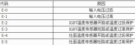 EO;鍋具檢測 E2;爐面溫度傳感器故障 E3;高電壓保護(hù) E4;低電壓保護(hù) E5爐面超