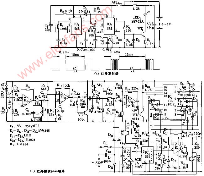 本文主要介紹了555遙控開關(guān)電路圖大全(五款模擬電路設(shè)計(jì)原理圖詳解)。紅外遙控開關(guān)包括紅外脈沖發(fā)射器和接收機(jī)兩部分。發(fā)射器以555為核心,組成無穩(wěn)態(tài)多諧振蕩器,它產(chǎn)生的交變脈沖驅(qū)動(dòng)紅外發(fā)射二極管發(fā)出紅外脈沖信號(hào)。接收機(jī)由紅外接收、放大電路和聲控觸發(fā)電路等組成。