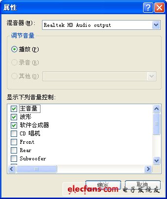 如果對話框中沒有這兩個選項,請點擊“選項”菜單——選擇“屬性”——在“顯示下列音量控制”中選中“音量控制”和“波形”兩項,再進行正確設(shè)定。
