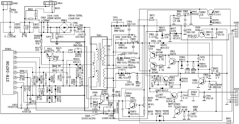 V901回路的另一個作用是,當(dāng)電網(wǎng)電壓降低時,VD903整流后的電壓也將降低,當(dāng)降低到6.6V以下時,V901會導(dǎo)通,繼續(xù)向STR-S6708的(9)腳供電,所以,這種開關(guān)電源適應(yīng)電網(wǎng)電壓的范圍很寬。