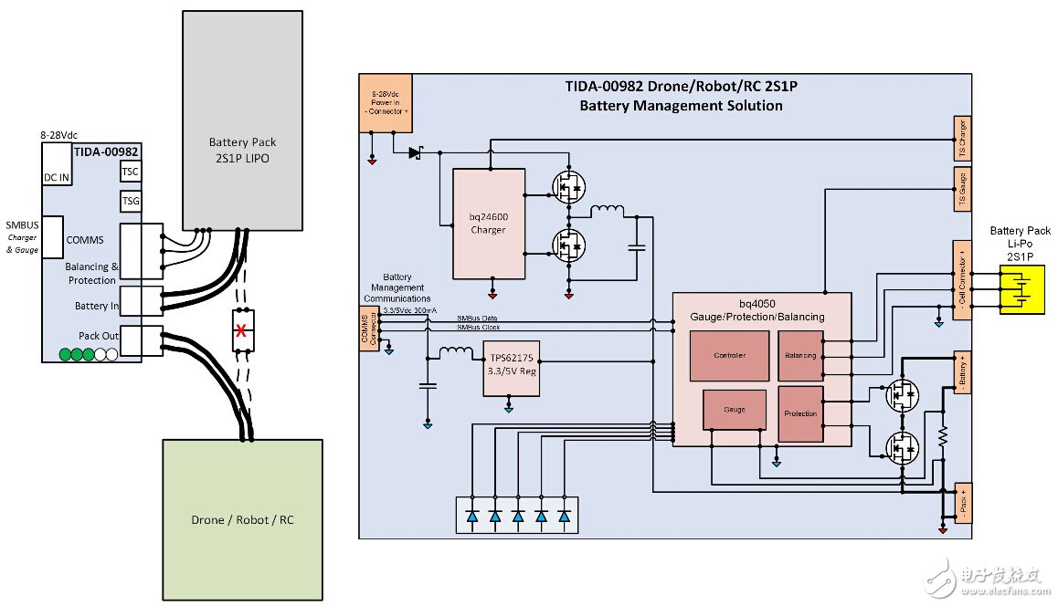 針對無人機(jī)突破性的電池管理:2S1P電池管理系統(tǒng)(BMS)參考設(shè)計將無人機(jī)電池組轉(zhuǎn)換為智能診斷黑匣子記錄儀。這款智能診斷黑匣子記錄儀可精確監(jiān)視剩余電量,并在整個電池使用期全程保護(hù)鋰離子電池。設(shè)計人