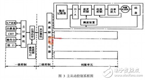2)主從控制系統(tǒng):采用主、從兩級處理器實(shí)現(xiàn)系統(tǒng)的全部控制功能。主CPU實(shí)現(xiàn)管理、坐標(biāo)變換、軌跡生成和系統(tǒng)自診斷等:從CPU實(shí)現(xiàn)所有關(guān)節(jié)的動作控制。其構(gòu)成框圖,如圖3所示。主從控制方式系統(tǒng)實(shí)時(shí)性較好,適于高精度、高速度控制,但其系統(tǒng)擴(kuò)展性較差,維修困難。