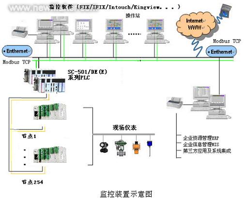 遠程監(jiān)控硬件主要包括上位機桌面電腦、SC-501/DE(E) 系列PLC、臺達10SS(v5.9及以上)小型PLC及模擬量模塊。SC-501/DE PLC是盟立公司最新推出的新版本控制器,主機自帶雙以太網(wǎng)口和COM1/2兩個通訊口,其中以太網(wǎng)口作為主站支持通過MODBUS TCP協(xié)議和下位機通訊,COM2口作為主站支持通過MODBUS協(xié)議/自由口通訊和下位機通訊。這樣就可以輕松實現(xiàn)和同樣支持MODBUS協(xié)議的臺達PLC的多平臺接入,監(jiān)控裝置系統(tǒng)示意參見下圖。