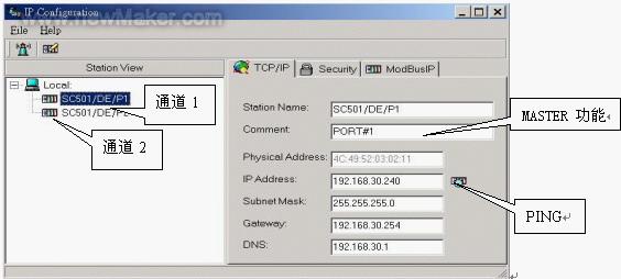 (3)TCP/IP 設(shè)置。如果能正常連接到SC-501/DE, 就可以修改 TCP/IP 參數(shù)了。 完成輸入后, 使用 “PING” 指令可以測試 TCP/IP連接。 【Station Name】 和【Comment”】是可選項。 如果沒有定義 【Station Name】, 名字由IPConfig自動分配。