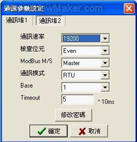 STEP 4: 設(shè)置COM2口通訊屬性。設(shè)置波特率、奇偶校驗、主從設(shè)置、ASCII/RTU、站號及Timeout時間。見下圖: