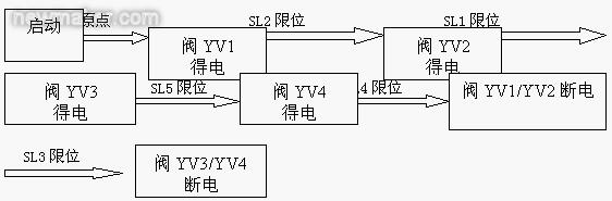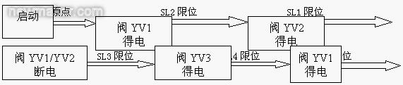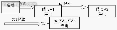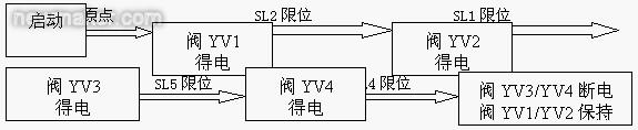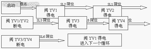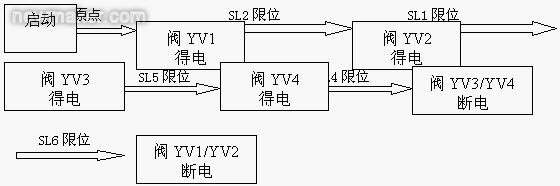 (3)單步工藝流程3描述:開(kāi)車啟動(dòng),恢復(fù)原點(diǎn),閥YV1得電,下托板前進(jìn)碰到下托板慢進(jìn)限位SL2后閥YV2得電下托板開(kāi)始慢進(jìn),下托板慢進(jìn)碰到前進(jìn)到位限位SL1后閥上托板前進(jìn)閥YV3得電上托板前進(jìn),上托板前進(jìn)碰到上托板慢進(jìn)SL5限位后,上托板慢進(jìn)閥YV4得電,上托板慢前進(jìn)碰到前進(jìn)到位限位SL4后閥YV1,YV2斷電下托板回退,碰到回退到位限位SL3信號(hào)后上托板前進(jìn)閥YV3,YV4斷電,上托板回位。