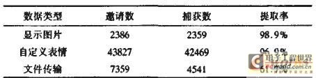 從上表可以看出顯示圖片和自定義表情的提取率均在96%以上。數(shù)據(jù)丟失的原因主要是由于丟包造成的,由于系統(tǒng)采用過(guò)濾策略進(jìn)行數(shù)據(jù)包捕獲,在網(wǎng)絡(luò)流量比較大的時(shí)候,可能會(huì)導(dǎo)致一定的丟包率,而顯示圖片和自定義表情文件比較都比較小,若干數(shù)據(jù)包的丟失對(duì)結(jié)果會(huì)有一定影響。文件傳輸?shù)奶崛÷手挥?1.7%,原因主要有3個(gè)方面:一是丟包率;二是協(xié)議分析中對(duì)NAT穿越的判斷結(jié)果;第三點(diǎn),也是最重要的一點(diǎn),當(dāng)傳輸?shù)碾p方位于同一局域網(wǎng)時(shí),實(shí)際數(shù)據(jù)傳輸僅在局域網(wǎng)中進(jìn)行,而不會(huì)通過(guò)服務(wù)器中轉(zhuǎn),這樣系統(tǒng)僅能監(jiān)聽(tīng)到傳輸邀請(qǐng),而無(wú)法監(jiān)聽(tīng)到實(shí)際傳輸?shù)臄?shù)據(jù)。測(cè)試結(jié)果沒(méi)有對(duì)文字信息進(jìn)行評(píng)估,因?yàn)槲淖中畔⒌膫鬏敍](méi)有握手過(guò)程,難以評(píng)估。系統(tǒng)的設(shè)計(jì)實(shí)現(xiàn)能夠保證在丟包率較小的情況下,使文字信息的提取率接近100%。