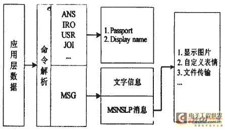 命令解析的本質(zhì)就是分析字符串的含義,它類(lèi)似計(jì)算機(jī)高級(jí)語(yǔ)言編譯器中詞法分析的功能。MSNP協(xié)議涉及多達(dá)幾十個(gè)命令,服務(wù)器和客戶(hù)端使用的命令也不相同。系統(tǒng)對(duì)涉及信息傳輸?shù)拿钸M(jìn)行了重點(diǎn)解析,主要包括握手命令和數(shù)據(jù)傳輸命令。對(duì)于客戶(hù)端命令。主要解析“ANS”和“MSG”。服務(wù)器端主要解析“IRO”、“USR”、“JOI”和“MSG”。