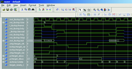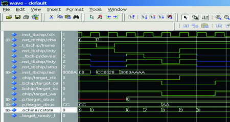 PCI規(guī)范中定義了三種讀寫操作,即Memory和I/O讀寫及配置讀寫。本方案不支持I/O讀寫,只支持Memory和配置的讀寫,下面給出Memory映射方式的單周期仿真讀寫時(shí)序。