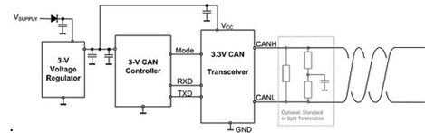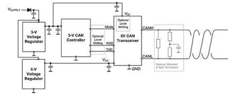 的總線電平,大部分CAN收發(fā)器總線驅動器需要5V電源供電。但電子系統(tǒng)的主電源通常不能滿足子系統(tǒng)的電源要求。這種情況下,提供的系統(tǒng)電源通常不能直接為CAN收發(fā)器供電,例如,系統(tǒng)可能只提供一個3.3V電源
