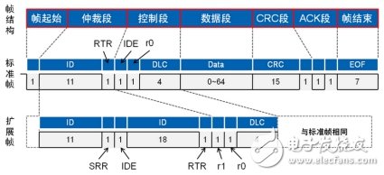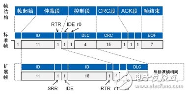 圖 1 標準數(shù)據(jù)幀跟擴展數(shù)據(jù)幀結(jié)構(gòu)圖