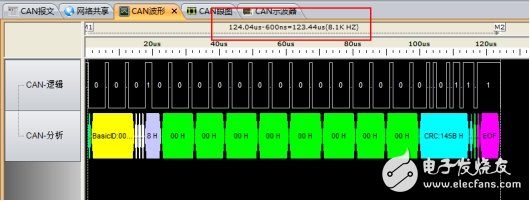 由于位填充規(guī)則的存在,所以就存在即使兩個幀都是標準數(shù)據(jù)幀,但發(fā)送不同ID或者數(shù)據(jù)段的時候報文時間會不同,圖5為1M波特率下ID跟數(shù)據(jù)都為0x00的標準數(shù)據(jù)幀報文。原本108個位的標準數(shù)據(jù)幀的真實的報文時間為123us。