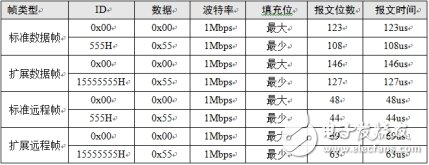 下表給出了標準數(shù)據(jù)幀、擴展數(shù)據(jù)幀、標準遠程幀、擴展遠程幀四種幀類型在發(fā)送不同ID和數(shù)據(jù)時位時間的差別。