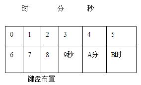 為實現(xiàn)時間調(diào)整,鍵盤布置如圖5-2所示。鍵號為9、A、B的三只鍵分別用作秒、分、時選擇鍵;鍵號為4、5的二只鍵分別用作減少和增加鍵。例如,需要“分”調(diào)整,則先按“分”鍵,再按“↓”或“↑”鍵。