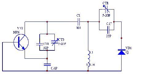 ??? 由交流等效電路圖可知該電路為電容反饋LC三端式振蕩器,其反饋系數(shù)F=(C11+CT3)/CAP,CAP可變?yōu)镃7、C14、C23、C19其中一個(gè)。其中Cj為變?nèi)?a target="_blank">二極管2CC1B,根據(jù)所加靜態(tài)電壓對(duì)應(yīng)其靜態(tài)電容。