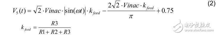 如圖1所示,C1大于C2,目的是實(shí)現(xiàn)更高的PF值,例如:C1/C2 = 220n/10n。LM3444或者LM3445的針腳5的電壓可以表示為:
