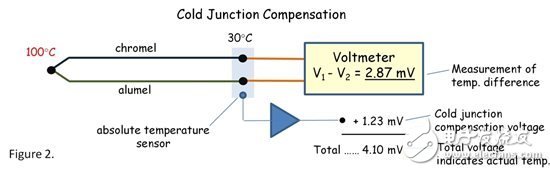 )的半導(dǎo)體傳感器完成。根據(jù)測(cè)量的冷結(jié)點(diǎn)溫度(請(qǐng)參見(jiàn)圖 2)一個(gè)與熱電耦系數(shù)相同的電壓被加了進(jìn)來(lái)。這一工作可以以模擬形式完成也可以以數(shù)字形式完成,稱為冷結(jié)點(diǎn)補(bǔ)償。如果冷結(jié)點(diǎn)為 0°C,那么這一合計(jì)的結(jié)果