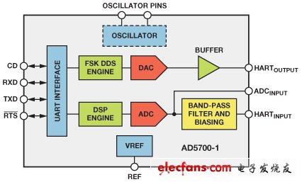 簡單的低成本可配置解決方案。AD5700 可以使用外部晶體、陶瓷諧振器或CMOS輸入。AD5700-1 是首款集成內(nèi)部低功耗 0.5%精密振蕩器的HART調(diào)制解調(diào)器IC,降低了所需的外部電路以及總體