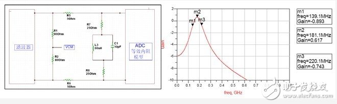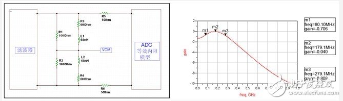 b) 然后以R1 和R2 各為100Ohm為仿真起點,出于帶內(nèi)平坦度的考量,仿真選取R-L-L-R的值。再平坦度滿足要求的情況下,嘗試降低R1和R2的值,但是需要適當增加R-L-L-R的等效阻抗作為彌補,最后找到實現(xiàn)ADC端組合負載目標前提下的R1和R2的最小取值。