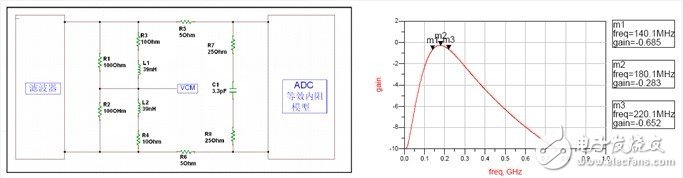 4) R7-L3//C1-R8組成的網(wǎng)絡(luò)則主要擔(dān)負吸收sampling glitch的責(zé)任。在50Ohm負載抗混疊濾波器的應(yīng)用中,50Ohm負載路徑即相當于采樣噪聲的低阻泄放路徑,所以R-L//C-R電路選配一般可以不加,但是當抗混疊濾波器的負載阻抗增加,例如上文中所提到的100Ohm抗混疊濾波器的應(yīng)用,R-L//C-R的網(wǎng)絡(luò)在性能要求較高的應(yīng)用中建議采用。采樣噪聲是由采樣開關(guān)的開關(guān)切換引起的。只有在ADC輸入pin腳處直接引入低阻通路才可以有效的將其吸收,這就是為何RLCR 網(wǎng)絡(luò)需要盡可能的接近ADC輸入管腳布局。否則,采樣噪聲會在dither的作用下轉(zhuǎn)化為影響ADC性能的噪聲從而惡化SNR和SFDR。此吸收采樣噪聲電路的最主要的組成部分為電容,采樣噪聲多為高頻分量組成,對其形成低阻通路即低通電路或帶通電路(對有用信號為高阻,對高頻噪聲為低阻)。C的取值不易過小,過小影響吸收效果,同樣也不易過大,過大會嚴重影響輸入帶寬。兩端串聯(lián)的R不易過大25Ohm為宜,并聯(lián)的電感主要是降低Q值,有助于平坦帶內(nèi)波動。當R3-L1-L2-R4 和R7-L3//C1-R8網(wǎng)絡(luò)共存的時候,出于帶內(nèi)平坦度的考量,需要移去L3形成R-CR網(wǎng)絡(luò)。