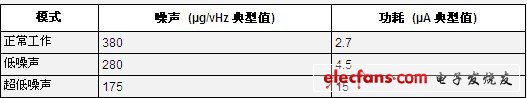 表1顯示了正常工作模式以及兩種低噪聲模式下的功耗值和噪聲密度,其中電源電壓典型值為3.3 V。