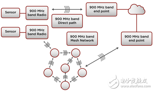 上文提到過(guò)的網(wǎng)狀網(wǎng)絡(luò)也使用這些頻段,該網(wǎng)絡(luò)由許多小型低功耗的無(wú)線設(shè)備組成,這些無(wú)線設(shè)備彼此高度相連,可將來(lái)自邊緣區(qū)域的傳感器數(shù)據(jù)匯集到一個(gè)集合點(diǎn),而這些集合點(diǎn)都與云端相連。這樣就保證了無(wú)線網(wǎng)絡(luò)的覆蓋范圍。