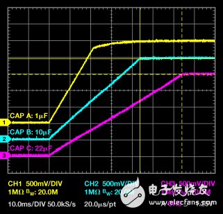 圖 4 AD7656-1 REFCAPA/B/C 引腳在不同電容下的電壓斜坡