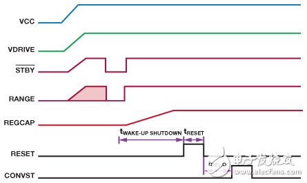 根據(jù)圖6所示,當STBY 和RANGE返回高電平時,AD7606從完全關(guān)斷進入正常工作模式,并配置為±10-V的范圍。此時, REGCAPA、REGCAPB和REGCAP引腳上電至數(shù)據(jù)手冊所述的正確電壓。在進入待機模式時,上電時間約為 100 μs,但在外部基準電壓源模式下,這需要大約13 ms。從關(guān)斷模式上電時,經(jīng)過所需的上電時間后,必須施加RESET信號。數(shù)據(jù)手冊將上電與RESET上升沿之間所需時間規(guī)定為 tWAKE-UP SHUTDOWN。