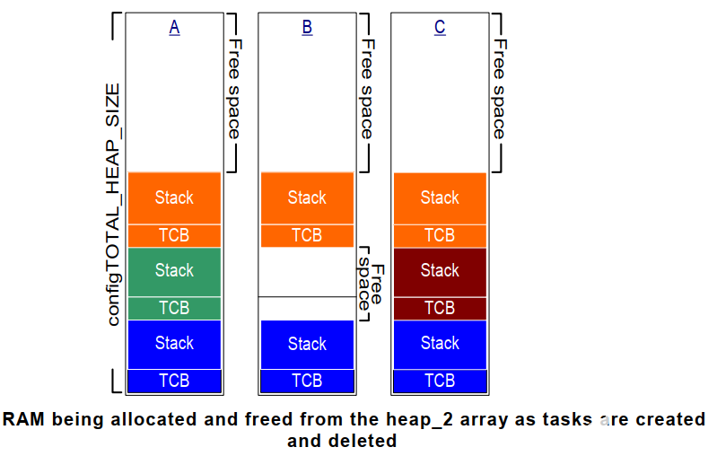 - B:刪除了一個(gè)任務(wù),空閑內(nèi)存有3部分:頂層的、被刪除任務(wù)的TCB空間、被刪除任務(wù)的Stack空間
