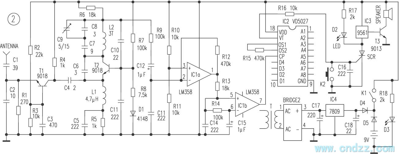 由天線輸入的300MHz射頻信號,經(jīng)C1送到T1的發(fā)射極,通過T1高頻放大后,經(jīng)C4送至超再生射頻解調器T2的發(fā)射極,解調出的編碼數(shù)據(jù)脈沖信號經(jīng)C12送至運放集成電路IC1的A1和A2進行放大和整形,最后送入解碼電路IC2的第腳進行數(shù)據(jù)解碼。解碼集成電路VD5027是編碼集成電路VD5026的配對電路。使用中VD5026和VD5027兩電路的地址碼A1~A8應絕對保持一致,它們的狀態(tài)碼也應保持一樣。當VD5026停止發(fā)送信號(發(fā)射機關機)時,VD5027的腳VT端復零。電路中利用單向可控硅SCR做報警保持,VD5027的腳呈高電平時,SCR被觸發(fā)導通,音樂片9561因得電而輸出報警信號,推動喇叭發(fā)聲,報警指示燈D2點亮。此后,即使VD5027的腳復零,由于可控硅SCR已導通,因而報警喇叭將一直發(fā)聲,直至按下報警解除開關K2為止。