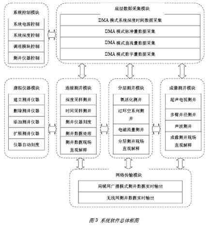 測井?dāng)?shù)據(jù)采集控制系統(tǒng)軟件主要由現(xiàn)場測控及數(shù)據(jù)采集軟件和測后數(shù)據(jù)分析處理軟件構(gòu)成,在軟件開發(fā)上,我們選擇使用VC++ 與NI 公司Measurement Studio 軟件包相結(jié)合的開發(fā)方式,用VC++開發(fā)與操作系統(tǒng)底層相關(guān)的程序和曲線打印輸出程序,使用Measurement Studio和CVI提供的類庫開發(fā)與數(shù)據(jù)實(shí)時采集和曲線顯示相關(guān)的程序。這種開發(fā)方案不但可以對操作系統(tǒng)進(jìn)行靈活的控制而且充分利用了NI 公司提供的開發(fā)工具,從而極大的縮短了系統(tǒng)軟件的開發(fā)時間。我們僅用了三個月的時間就完成了系統(tǒng)軟件的設(shè)計(jì),開發(fā)和測試工作。圖2為系統(tǒng)軟件中的脈沖中子氧活化測井及解釋軟件序界面。圖3為系統(tǒng)軟件總體框圖。