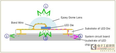 然而,現(xiàn)階段的整個系統(tǒng)之散熱瓶頸,多數(shù)發(fā)生在將熱量從LED晶粒傳導(dǎo)至其基板再到系統(tǒng)電路板為主。此部分的可能散熱途徑:其一為直接藉由晶粒基板散熱至 系統(tǒng)電路板(如圖三途徑2所示),在此散熱途徑里,其LED晶?;宀牧系臒嵘⒛芰礊橄喈?dāng)重要的參數(shù)。另一方面,LED所產(chǎn)生的熱亦會經(jīng)由電極金屬導(dǎo)線 而至系統(tǒng)電路板,一般而言,利用金線方式做電極接合下,散熱受金屬線本身較細(xì)長之幾何形狀而受限(如圖三途徑3所示);因此,近來即有共晶 (Eutectic) 或覆晶(Flip chip)接合方式,此設(shè)計大幅減少導(dǎo)線長度,并大幅增加導(dǎo)線截面積,如此一來,藉由LED電極導(dǎo)線至系統(tǒng)電路板之散熱效率將有效提升(如圖三途徑4所 示)。