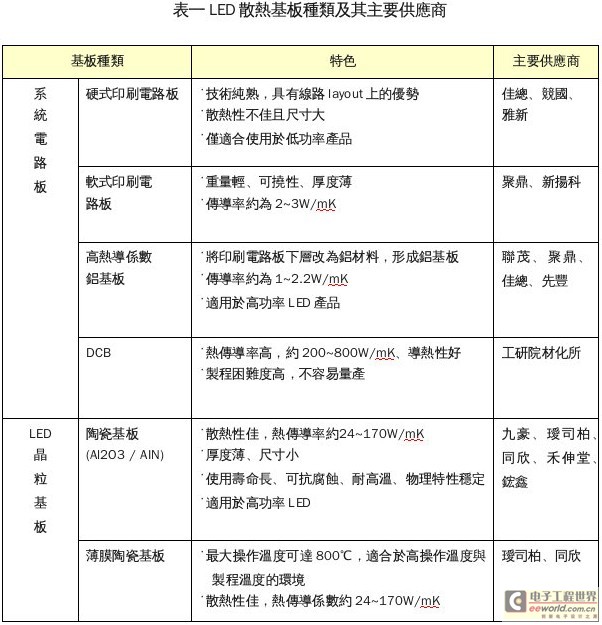 近年來,由于鋁基板的開發(fā),使得系統(tǒng)電路板的散熱問題逐漸獲得改善,甚而逐漸往可撓曲之軟式電路板開發(fā)。另一方面,LED晶粒基板亦逐步朝向降低其熱阻方向努力,下表一即為目前國內(nèi)常見的系統(tǒng)電路板以及LED晶?;宸N類與主要供應(yīng)商: