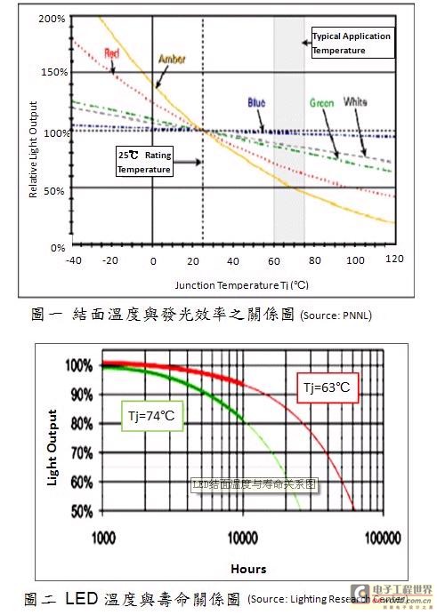 一般而言,LED發(fā)光時所產(chǎn)生的熱能若無法導(dǎo)出,將會使LED結(jié)面溫度過高,進(jìn)而影響產(chǎn)品生命周期、發(fā)光效率、穩(wěn)定性,而LED結(jié)面溫度、發(fā)光效率及壽命之間的關(guān)系,以下將利用關(guān)系圖作進(jìn)一步說明。