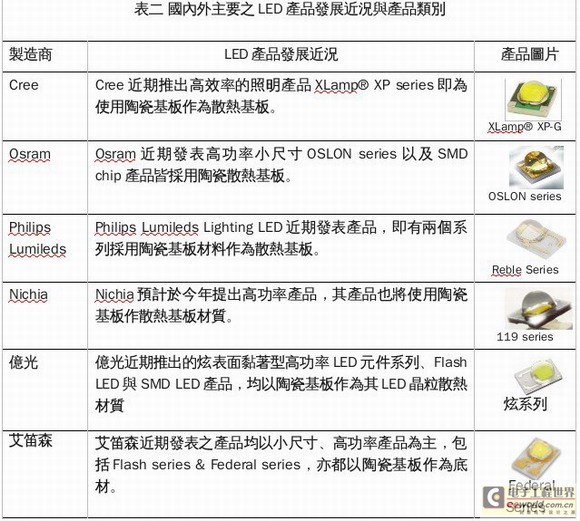 目前LED產(chǎn)品發(fā)展的趨勢,可從LED各封裝大廠近期所發(fā)表的LED產(chǎn)品功率和尺寸觀察得知,高功率、小尺寸的產(chǎn)品為目前LED產(chǎn)業(yè)的發(fā)展重點,且均使用陶瓷散熱基板作為其LED晶粒散熱的途徑。因此,陶瓷散熱基板在高功率,小尺寸的LED產(chǎn)品結(jié)構(gòu)上,已成為相當(dāng)重要的一環(huán),以下表二即為國內(nèi)外主要之 LED產(chǎn)品發(fā)展近況與產(chǎn)品類別作簡單的匯整。