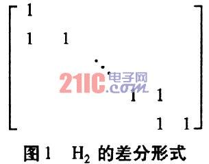 ??? RA碼編碼就是將信息位u中的每一位重復(fù)q次,經(jīng)過交織以后輸入傳輸函數(shù)為的累加器,經(jīng)過累加即得到校驗位p,完成編碼。RA碼可分為非系統(tǒng)碼和系統(tǒng)碼兩類,RA碼與IRA碼系統(tǒng)碼的校驗矩陣可以表示為H=[H1H2]。H1的列重為{db,t},行重為{dc,i}。H2具有差分形式: