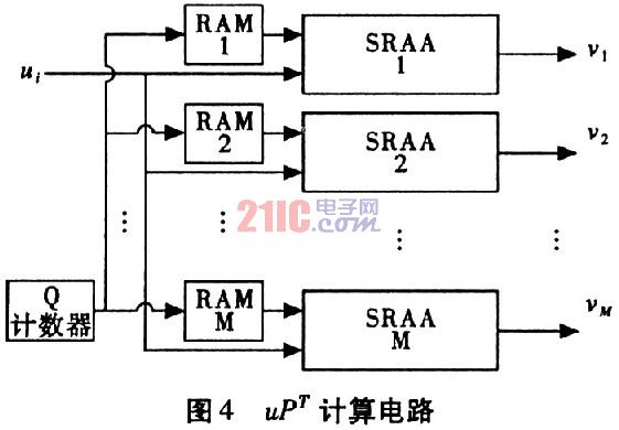 ??? Stagel:串行輸入信息u,每個輸入的信息ui分成兩路,一路依次存入Bufferl緩存器,另一路輸入uPT計算電路,計算結(jié)果v保存在SRAA電路的寄存器中。