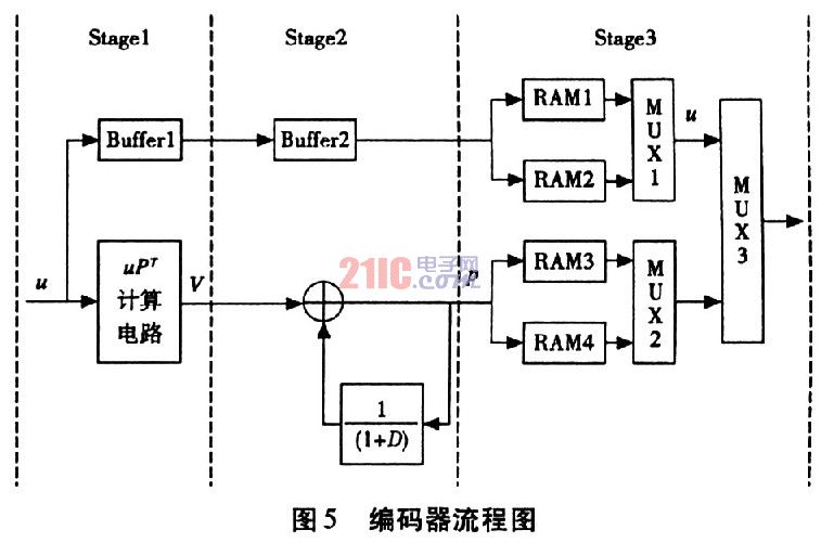 ??? Stage3:將RAMl或RAM2中的信息位u以及RAM3或RAM4中的校驗位p依次讀出,完成碼字的串行輸出。