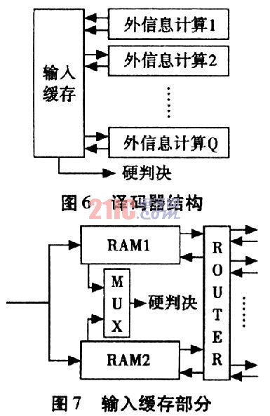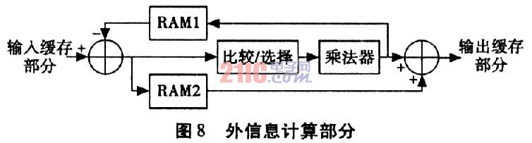 ??? 從輸入緩存部分輸入的外信息與RAMl中的相減得到,將存人RAM2,并輸入比較/選擇器。當(dāng)該行的全部計算完畢后,從比較/選擇器輸出,經(jīng)過乘法器得到的存入RAMl,并與緩存在RAM2中的相加,得到,即完成一次迭代。由于RAM2中的數(shù)據(jù)輸出可以連續(xù)地輸入輸出,因此在輸入完該次迭代的所有后,馬上可以接著輸入下一次迭代的,從而譯碼可以連續(xù)地進行。